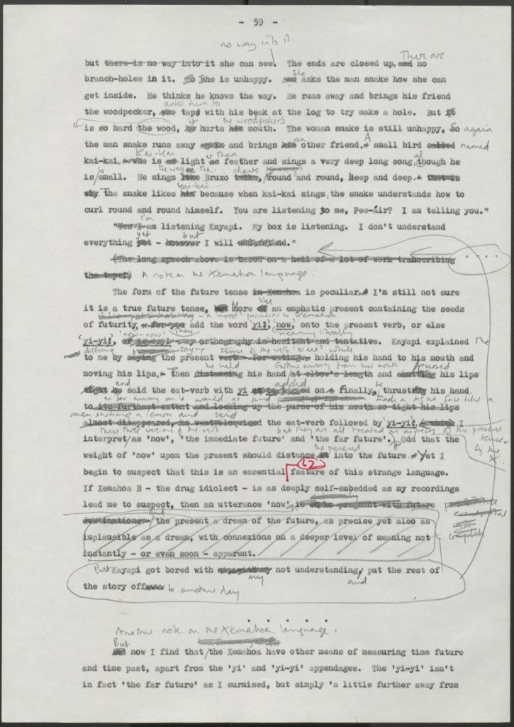 We can see an interesting example of this on page 59 of the manuscript. This section is from the perspective of Pierre, a linguist and anthropologist working with the Brazilian Xemahoa tribe trying to understand their language. Here he describes how the two forms of the language, Xemahoa A which is spoken everyday by the tribe, and Xemahoa B, the deeply embedded language which can only be accessed through ritualistic drug use, deal with the present tense. We can see that originally, Watson has written: