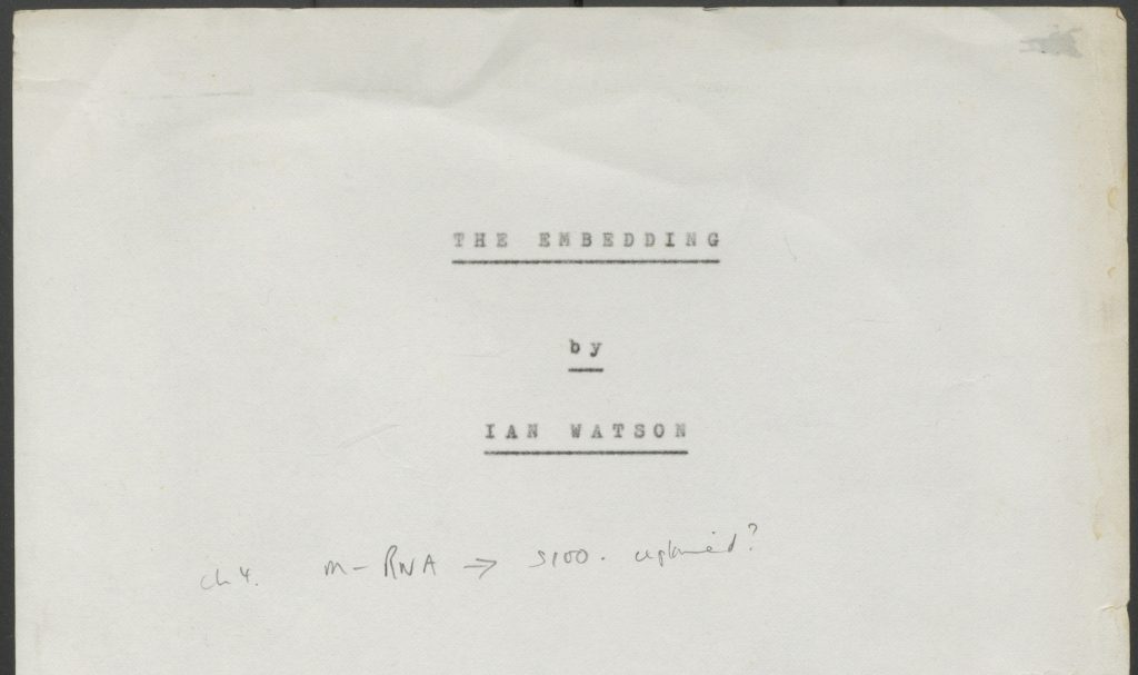That The Embedding (1973, Gollancz) was Ian Watson’s debut novel speaks to his remarkable intellect and literary ambition. The novel is a complex work that engages with linguistics as seriously and as rigorously as any hard science fiction novel does with physics. Watson interweaves three narrative threads, one about a Brazilian tribe whose language alters the perception of those who use it, one following deeply unethical linguistic and perceptual experiments on children to expand the capacity of the human brain, and one following a spaceship heading towards Earth bringing with it humanity’s first contact with an alien race. Watson’s archives are housed in Science Fiction Collections held at the University of Liverpool’s Special Collections and Archives department. One of the items in the archive is the original manuscript for The Embedding. The box folder contains both the e manuscript, in this case the final version sent to the publisher for typesetting and printing, and the d manuscript, the version before this. The d manuscript is particularly interesting, because it shows the extent to which Watson was editing and rewriting even at this late stage. Items like this demonstrate the kind of insights the archive can offer into the study of science fiction.
